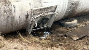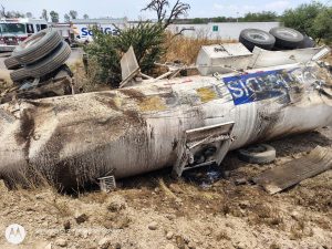 Un tractocamión que transportaba dos contenedores de diésel, cada uno con una capacidad de 32 mil litros, sufrió una volcadura esta tarde en la Carretera Libre Lagos de Moreno – Unión de San Antonio, a las afueras de las instalaciones de la empresa Soni Gas.