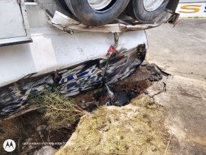 Los dos contenedores, que se encontraban al 100% de su capacidad, terminaron fuera de la cinta asfáltica. Uno de ellos, ubicado junto al tractocamión, presentó dos fisuras en su costado, mientras que el segundo registra una fuga por la escotilla superior.