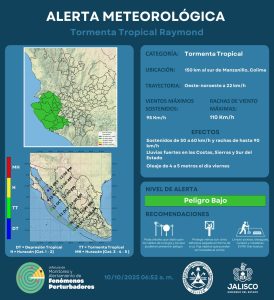 La Unidad Estatal de Protección Civil y Bomberos Jalisco (UEPCBJ) ha emitido un comunicado para informar a la población sobre la situación generada por la Tormenta Tropical «Raymond».