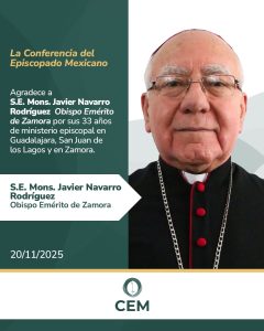 La Conferencia del Episcopado Mexicano expresa su más sincero agradecimiento a Mons. Javier Navarro Rodríguez, quien ahora es Obispo Emérito de Zamora, por sus 33 años de dedicación al ministerio episcopal. Su servicio pastoral se extendió a las diócesis de Guadalajara, San Juan de los Lagos y, finalmente, Zamora.